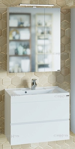 Комплектация: зеркало, шкаф, полочки, подсветка.