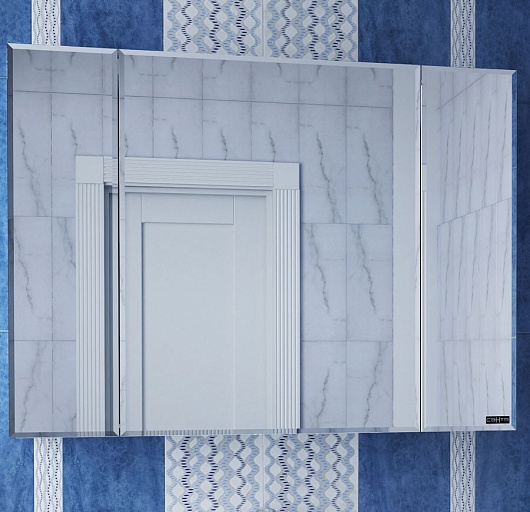 Зеркальное полотно с фацетом. Три распашных дверцы, вкладные полки. Фасад изделия из МДФ с покрытием ПВХ пленкой методом мембранно-вакуумного прессования, что позволяет достичь почти 100% водонепроницаемости.