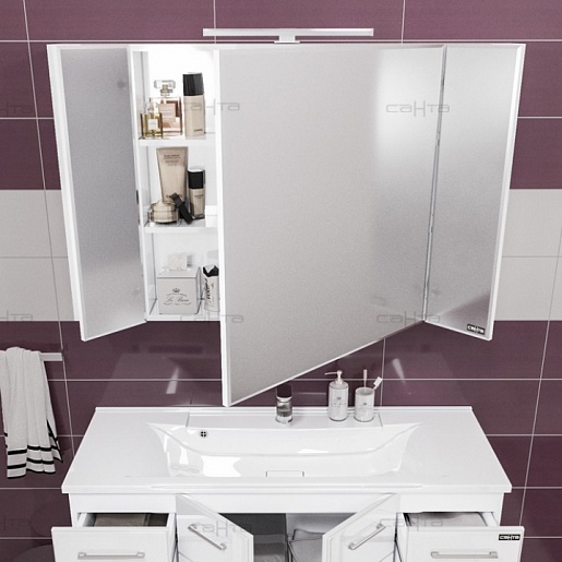 Описание: влагостойкое зеркальное полотно с фацетом, три распашных дверцы, вкладные полки. Фасад покрыт пленкой.