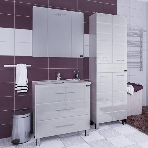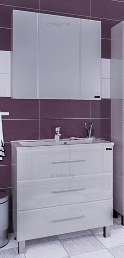 «Омега 90» – это напольный комплект мебели для ванной от «СанТа», состоящий из трёх элементов: зеркального шкафа «Стандарт 90», умывальника Elen 90 из цельного мрамора и вместительной напольной тумбой с тремя секциями. Вся мебель изготовлена из прочного ЛДСП, способного выдержать значительные нагрузки, а также стойкого к перепадам температур и воздействию влаги.