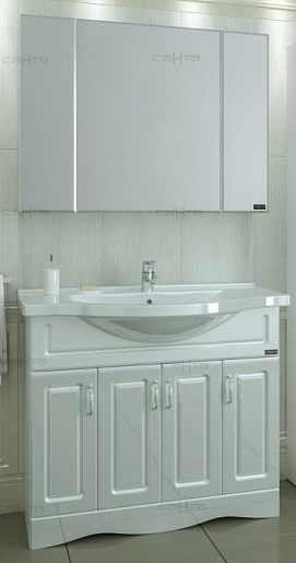 Цвет: белый Описание: влагостойкое зеркальное полотно, три распашных дверцы, вкладные полки. Фасад покрыт пленкой