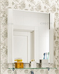 Комплектация: зеркальное влагостойкое полотно с фацетом и декоративными планками, стеклянная полочка, крепления.