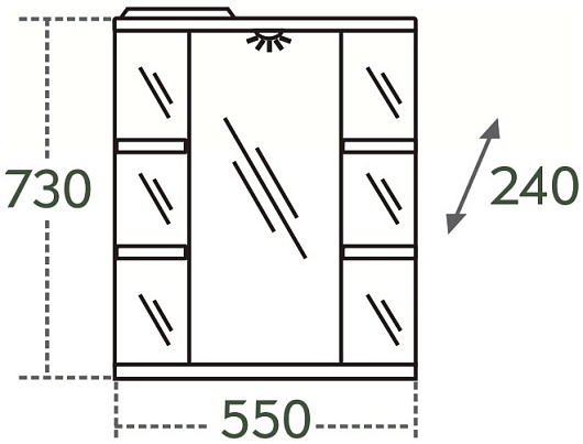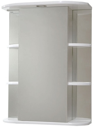 Описание: влагостойкая, зеркальная, распашная дверца (петли справа), полочки. В карниз встроены подсветка, выключатель и розетка.