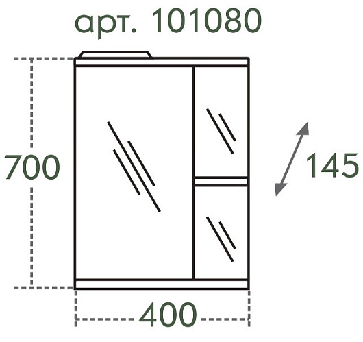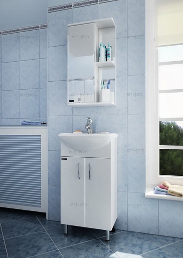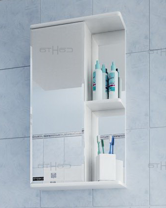 Описание: влагостойкая зеркальная распашная дверца, полочки.