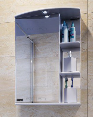 Описание: влагостойкая зеркальная распашная дверца, полочки, встроенный светильник, выключатель, розетка.