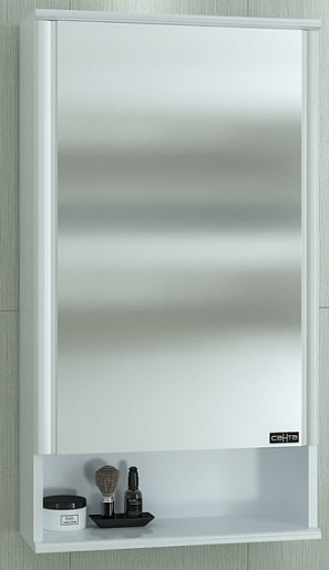 Описание: влагостойкое зеркальное полотно, шкафчик, вкладные полки. Фасад покрыт пленкой.