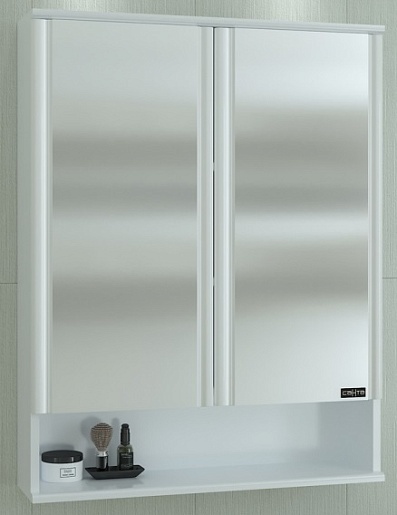 Описание: влагостойкое зеркальное полотно, шкафчик, вкладные полки. Фасад покрыт пленкой.