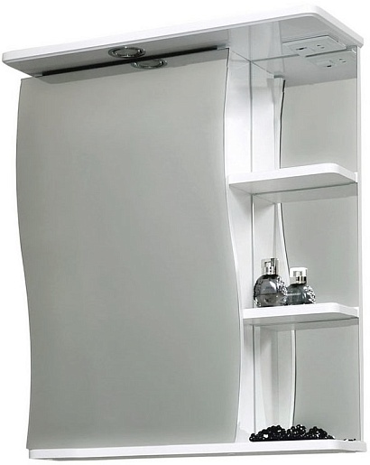 Описание: влагостойкая зеркальная распашная дверца, полочки, встроенная подсветка, розетка и выключатель. Габаритная ширина двери увеличивается при открывании на 2,5 см.