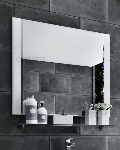 Комплектация: зеркальное влагостойкое полотно с фацетом и декоративными планками, стеклянная полочка, крепления.