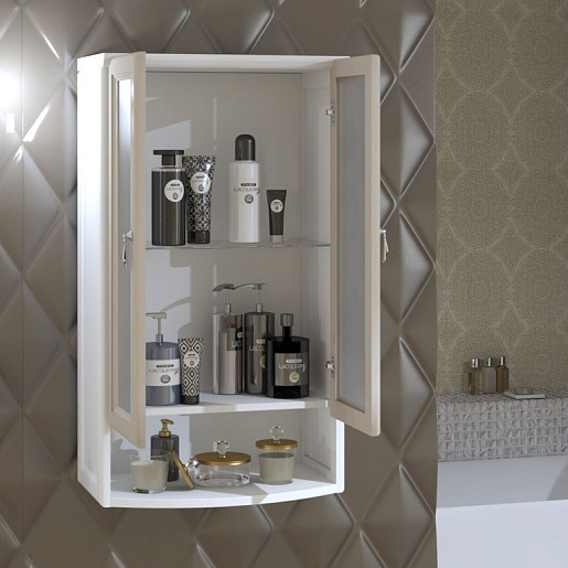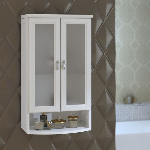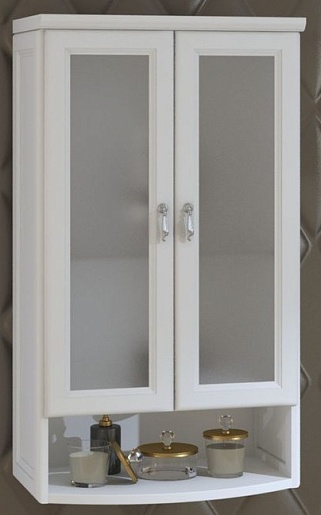 Описание: подвесной шкаф для ванной с открытой нишей и двумя застекленными распашными фасадами. Внутреннее пространство оборудовано двумя полками из матового стекла.