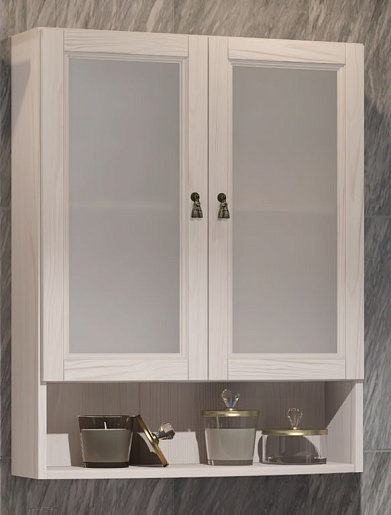 Описание: подвесной шкаф для ванной с открытой нишей и двумя застекленными распашными фасадами. Внутреннее пространство оборудовано полкой.
