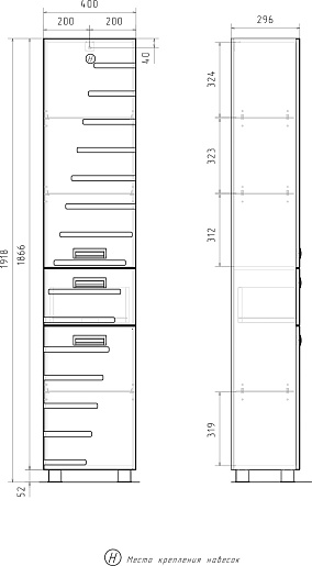- 2 распашные дверцы, 1 выдвижной ящик.