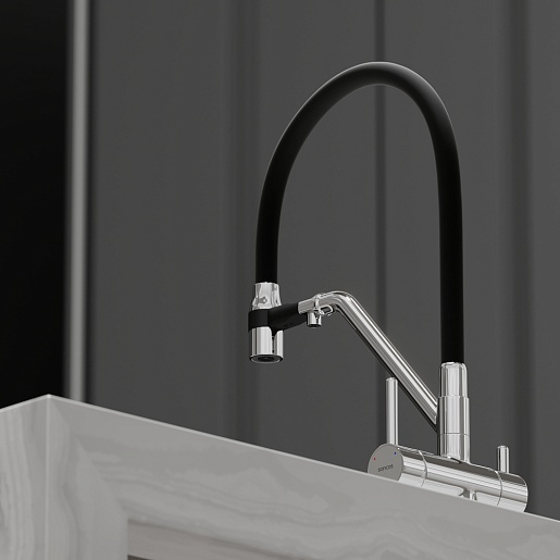 - Гибкий излив более маневренный, чем обычный, и позволяет настроить высоту и угол излива под любые нужды.
