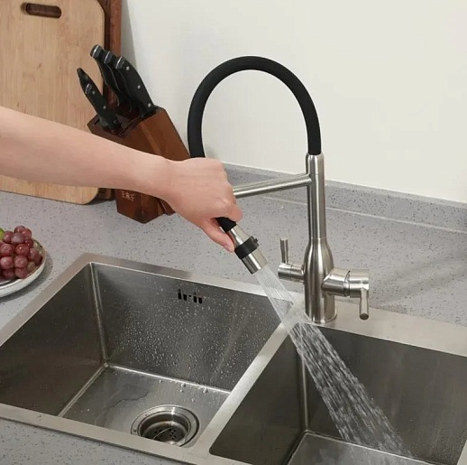 - Гибкий излив более маневренный, чем обычный, и позволяет настроить высоту и угол излива под любые нужды.