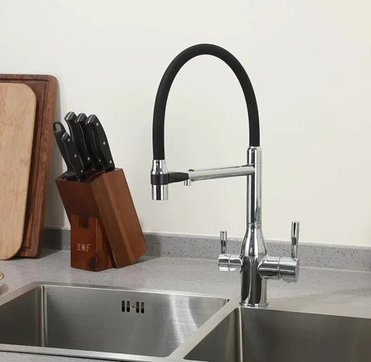 - Гибкий излив более маневренный, чем обычный, и позволяет настроить высоту и угол излива под любые нужды.