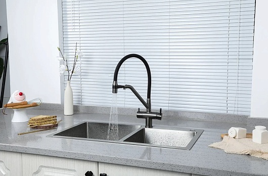- Гибкий излив более маневренный, чем обычный, и позволяет настроить высоту и угол излива под любые нужды.