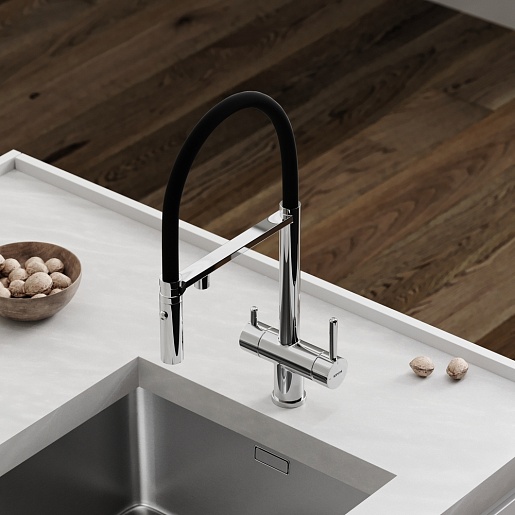 - Гибкий излив более маневренный, чем обычный, и позволяет настроить высоту и угол излива под любые нужды.