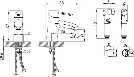 Комплектация: смеситель, лейка, душевой шланг, держатель лейки, комплект гибкой подводки.