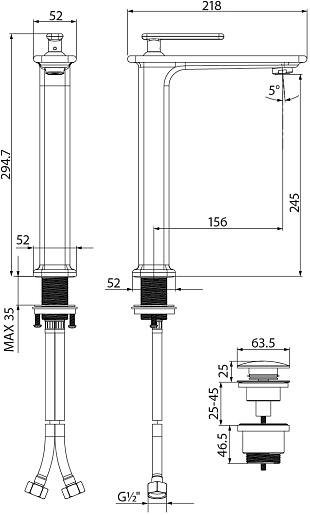 Комплектация: смеситель, донный клапан, комплект гибкой подводки.
