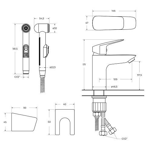 - Оснащение: аэратор, гибкая и жесткая подводка, гигиенический душ с держателем из ABS-пластика, душевой шланг металлический 150 см.