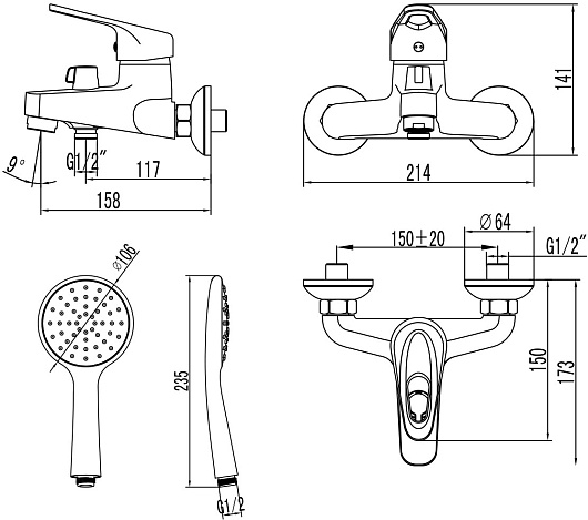 Комплектация: смеситель, душевая лейка, душевой шланг, держатель лейки, комплект эксцентриков с отражателями.