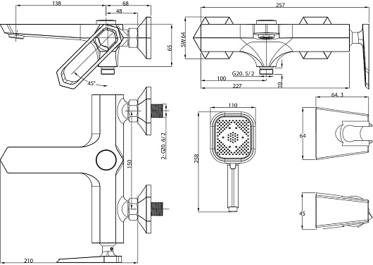Комплектация: смеситель, душевая лейка, душевой шланг, держатель лейки, комплект эксцентриков с отражателями.