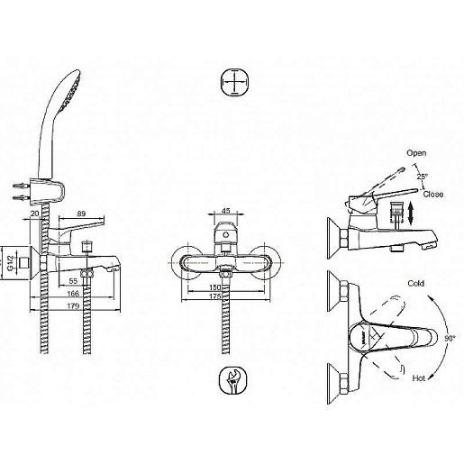 - Оснащение: душевая лейка / душевой шланг / настенный держатель.