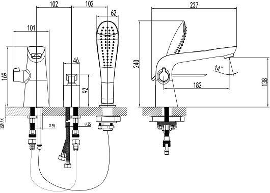 - Монтаж: встраиваемый в борт ванны, на 3 отверстия.
