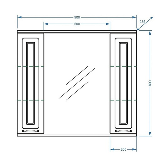 Описание: влагостойкое зеркальное полотно, шкафчики, полки, подсветка.
