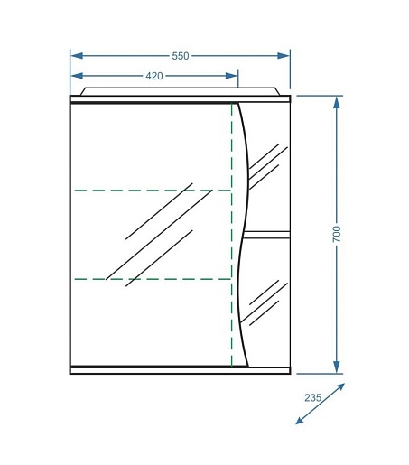 Описание: влагостойкое зеркальное полотно, шкафчик, открытые полки, подсветка.