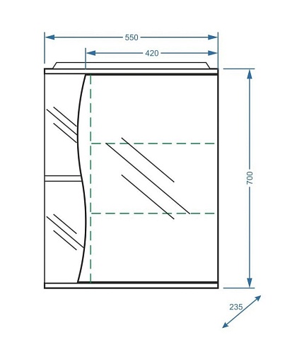 Описание: влагостойкое зеркальное полотно, шкафчик, открытые полки, подсветка.