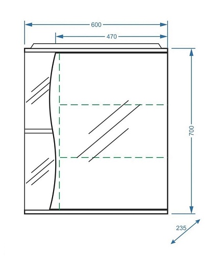 Описание: влагостойкое зеркальное полотно, шкафчик, открытые полки, подсветка.
