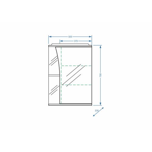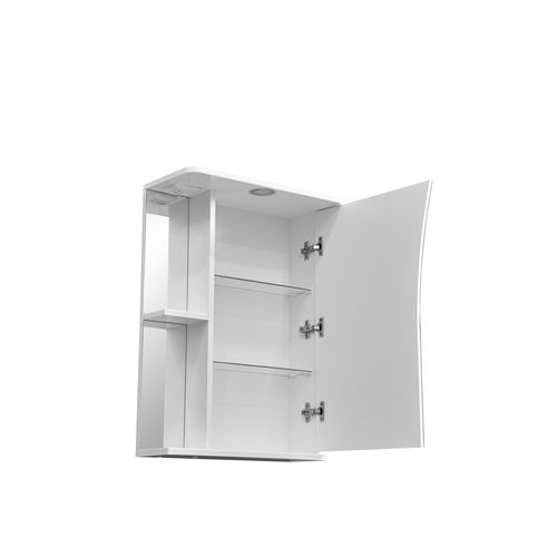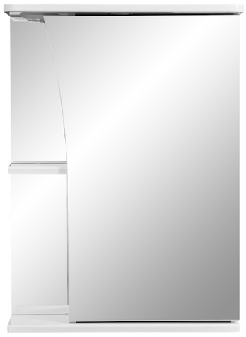 Описание: влагостойкое зеркальное полотно, шкафчик, открытые полки, подсветка.