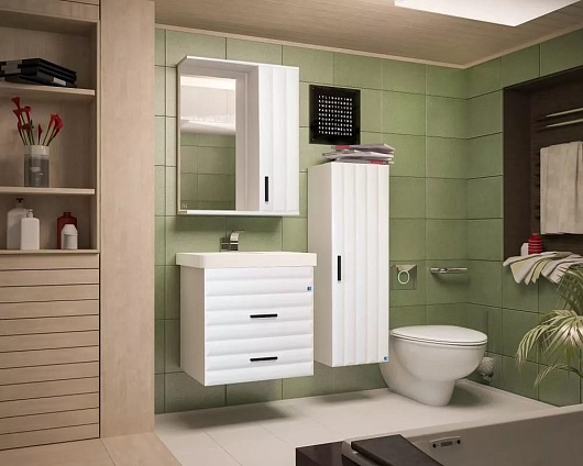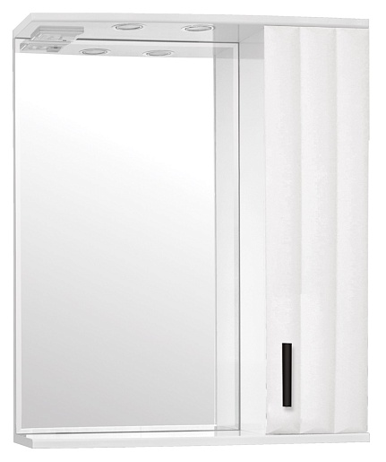 Описание: зеркальное полотно с распашным шкафчиком и нижней полкой. Стеклянные полки с еврокромкой и прозрачными полкодержателями.