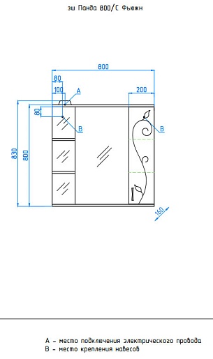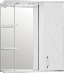 Описание: зеркальное полотно с распашным шкафчиком с нижней полкой и боковыми полками. В козырьке встроенная подсветка, выключатель с розеткой. Декоративная фрезеровка фасадов. Высокоточная обработка кромки фацетом 10 мм придает изделию законченный вид и защищает от порезов. Стеклянные полочки в зеркальных шкафах. Край полочек имеет трапецевидную еврокромку. Прозрачные полкодержатели с фиксацией.