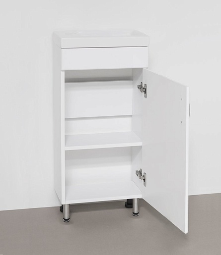 - напольная тумба под раковину: распашная дверца, металлическая ручка, ножки.