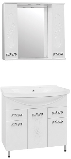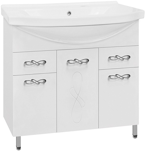 - напольная тумба под раковину: распашные дверцы, три ящика, стильные хромированные ручки, ножки