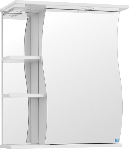 Описание: шкафчик с зеркальным распашным фасадом в форме волны, боковые открытые полки. В козырьке встроенный светильник, выключатель с розеткой.