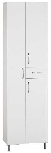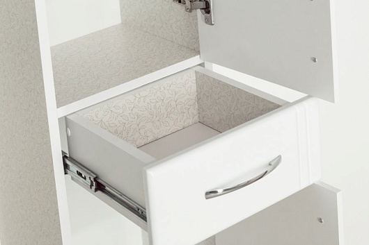Описание: Напольный пенал для ванной с распашными дверцами с внутренними полками и выдвижным ящиком, корзиной.