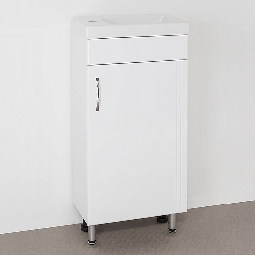- напольная тумба под раковину: распашная дверца, металлическая ручка, ножки.