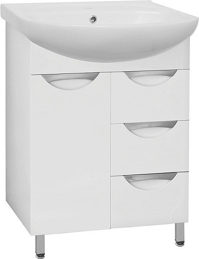 - напольная тумба под раковину: распашная дверца, 3 выдвижных ящика, стильные врезные ручки, ножки