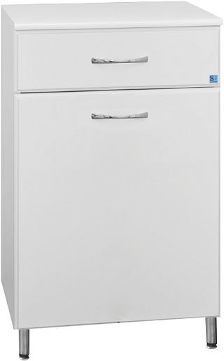 • Напольная тумба для ванной с выдвижным ящиком и бельевой корзиной.