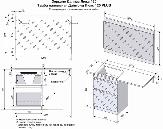 Напольная тумба под раковину Style Line Даймонд 120 Glass Люкс Plus 2 ящика - арт. СС-00000560.