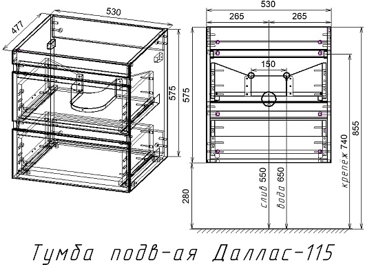 Подвесная тумба под раковину Style Line Даллас 115 R 2 ящика - арт. СС-00000651 / СС-00000519.