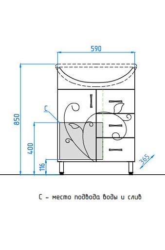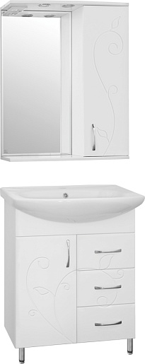 - напольная тумба под раковину: распашная дверца, 3 выдвижных ящика, хромированные ручки, ножки. Декоративная фрезеровка фасадов.