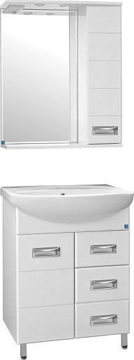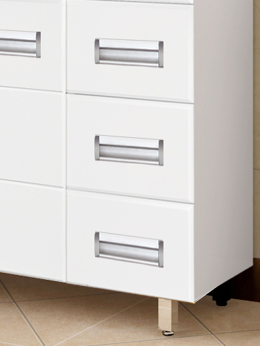 - напольная тумба под раковину: распашная дверца, 3 выдвижных ящика, врезные ручки с комбинированным покрытием хром и матовый хром, ножки