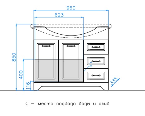 - напольная тумба под раковину: 2 распашные дверцы, 3 выдвижных ящика, стильные врезные ручки, ножки