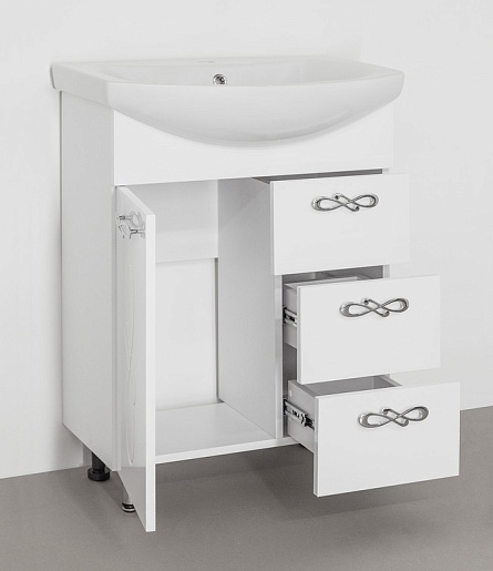 - напольная тумба под раковину: распашная дверца, ящики, хромированные ручки, ножки