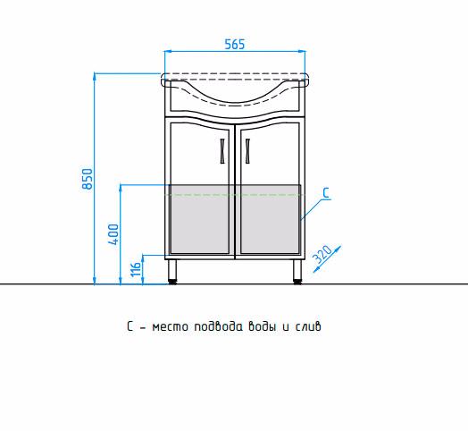 - напольная тумба под раковину: 2 распашные дверцы, металлические ручки, ножки.