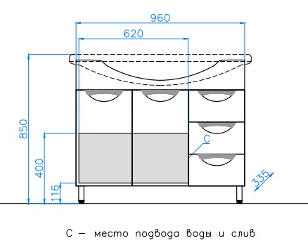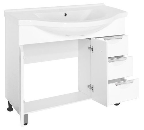 - напольная тумба под раковину: 2 распашные дверцы, 3 выдвижных ящика, стильные врезные ручки, ножки
